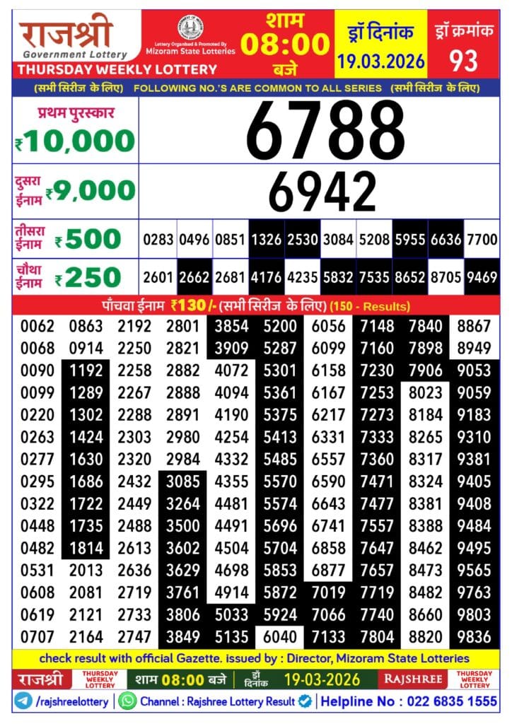 Rajshree Thursday Weekly Lottery 19.03.2026 Result 8 PM 0 Likes 57 Views Related Articles 0 51Maharashtra Mohini Weekly Draw 15.03.2026 Result 4.30 PM 0 26Maharashtra Akarshak Pushkaraj Weekly Draw Result 02.04.2026 0 73Punjab State Dear 200 Monthly Lottery 7 Febraury 2026 At 6 PM 0 120Dear 10 Pine Tuesday 7 pm daily result 22 July 2025
