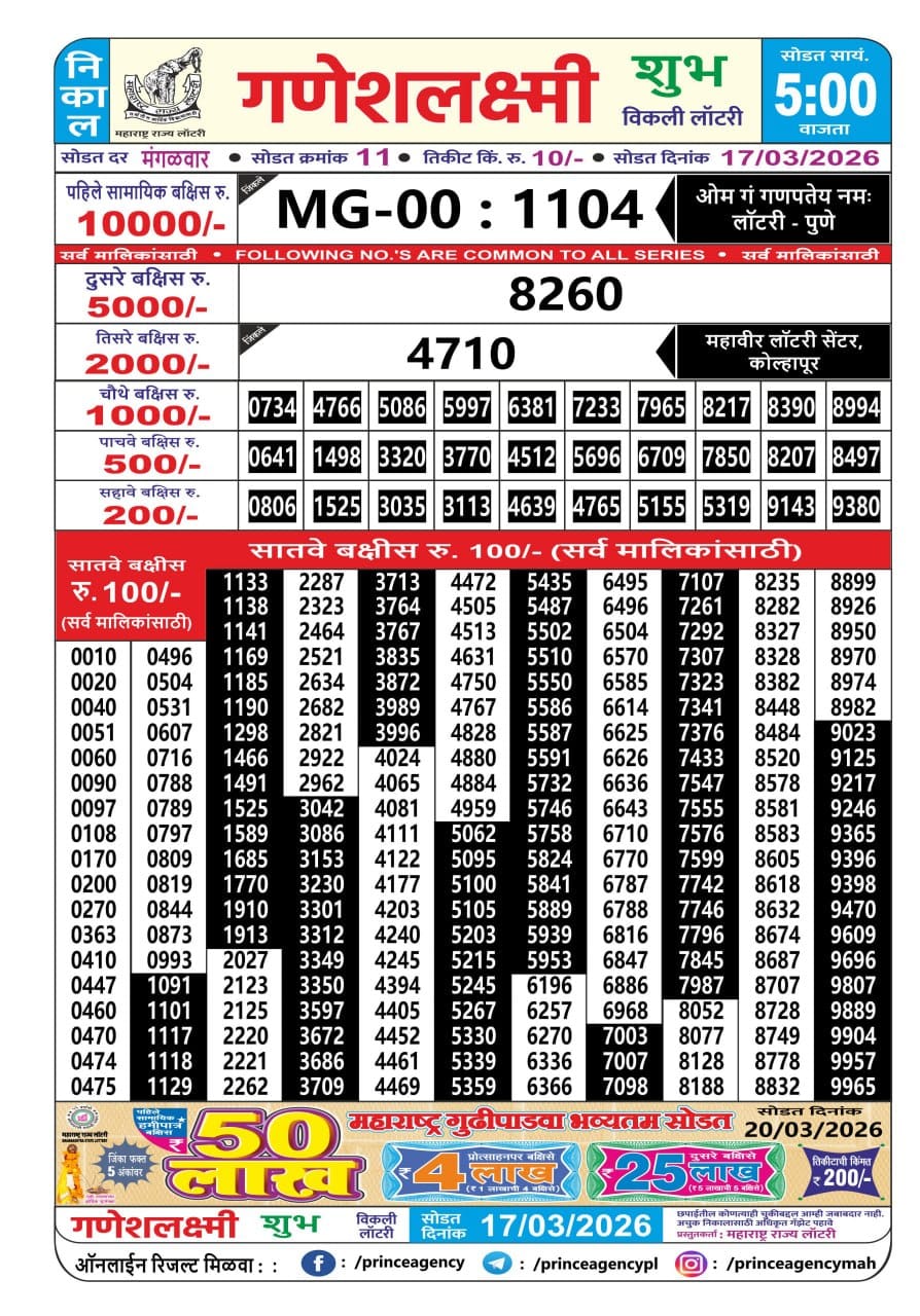Rajshree Thursday Weekly Lottery 26.2.2026 Result 8 PM 0 Likes 37 Views Related Articles 0 188Punjab state dear 1000 monthly lottery 13-09-2025 At 8 PM 0 44Golden Star Shani Weekly Lottery 28.02.2026 Result 7 PM 0 72Maharashtra Ganeshlaxmi Shubh Weekly Draw 17.03.2026 Result 5 PM 0 90Punjab State Dear 20 Monthly Lottery 27.1.2026 Result 7 PM