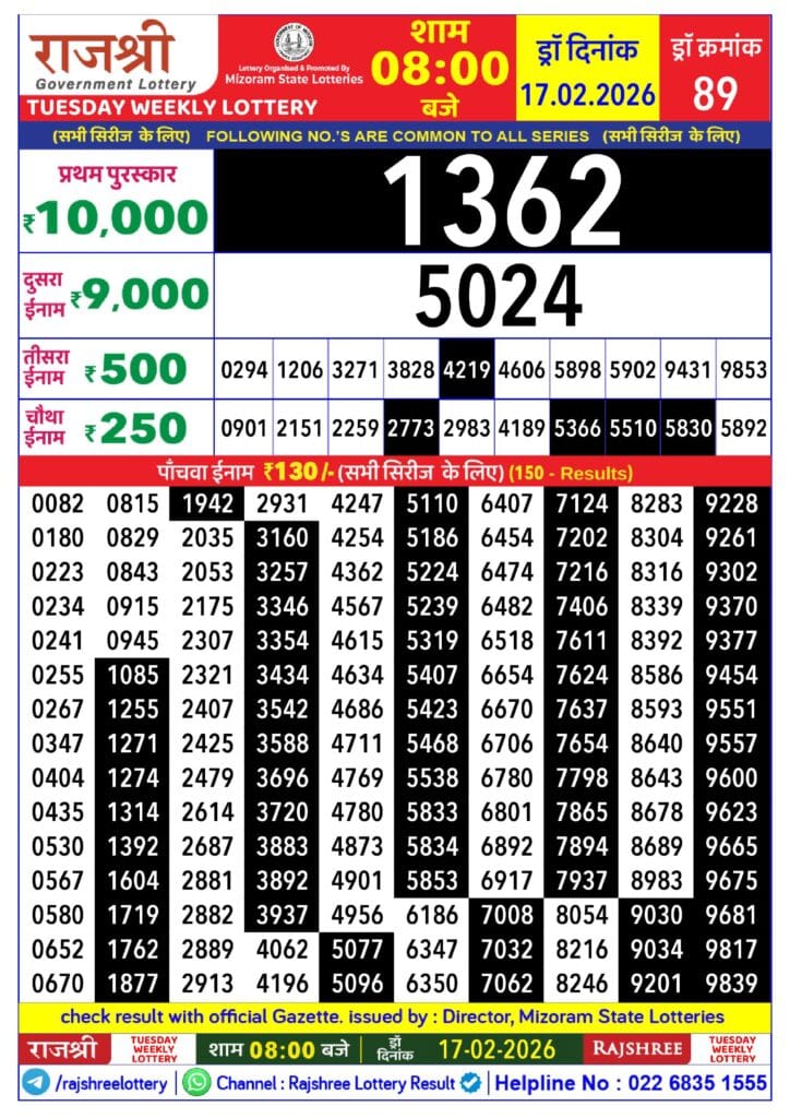 Rajshree Tuesday Weekly Lottery 17.2.2026 Result 8 PM 0 Likes 19 Views Related Articles 0 31Rajshree 300 Monthly Lottery 17.2.2026 At 6.30 PM 0 65Maharashtra Padmini Weekly Draw Result 13.01.2026 0 33Rajshree 50 Som Weekly Lottery 16.02.2026 Result 7.30 PM 1 88Punjab State Dear 50 Colt Friday 6pm Lottery Result 02.01.2026