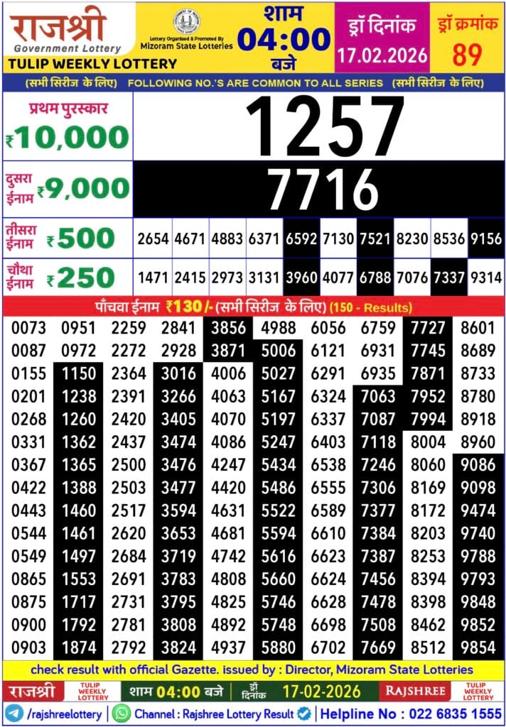 Rajshree Tulip Tuesday Weekly Lottery 17.02.2026 Result 4 PM 0 Likes 37 Views Related Articles 0 71Punjab State Dear 50 Ranger Sunday Weekly Lottery 22.2.2026 Result 5 PM 0 32Rajshree Shani Weekly Lottery 28.03.2026 Result 2.25 PM 0 139Maharashtra Gajlaxmi Guru Draw 20.11.2025 Result 4.45pm 0 46Maharashtra Ganeshlaxmi Dhan Weekly Draw 30.01.2026 Result 5pm
