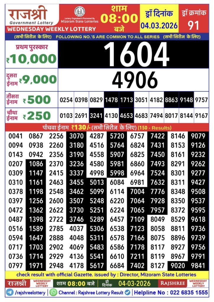 Rajshree Wednesday Weekly Lottery 04.03.2026 Result 8 PM 0 Likes 62 Views Related Articles 0 68Maharashtra Gajlaxmi Mangal Weekly Draw 24.02.2026 Result 4.45 PM 0 82Maharashtra Gajlaxmi Shani Weekly Draw 28.02.2026 Result 4.45 PM 0 36Maharashtra Gajlaxmi Shani Weekly Draw 28.03.2026 Result 4.45 PM 0 76Maharashtra Ganeshlaxmi Vaibhav Weekly Draw 01.02.2026 Result 5pm