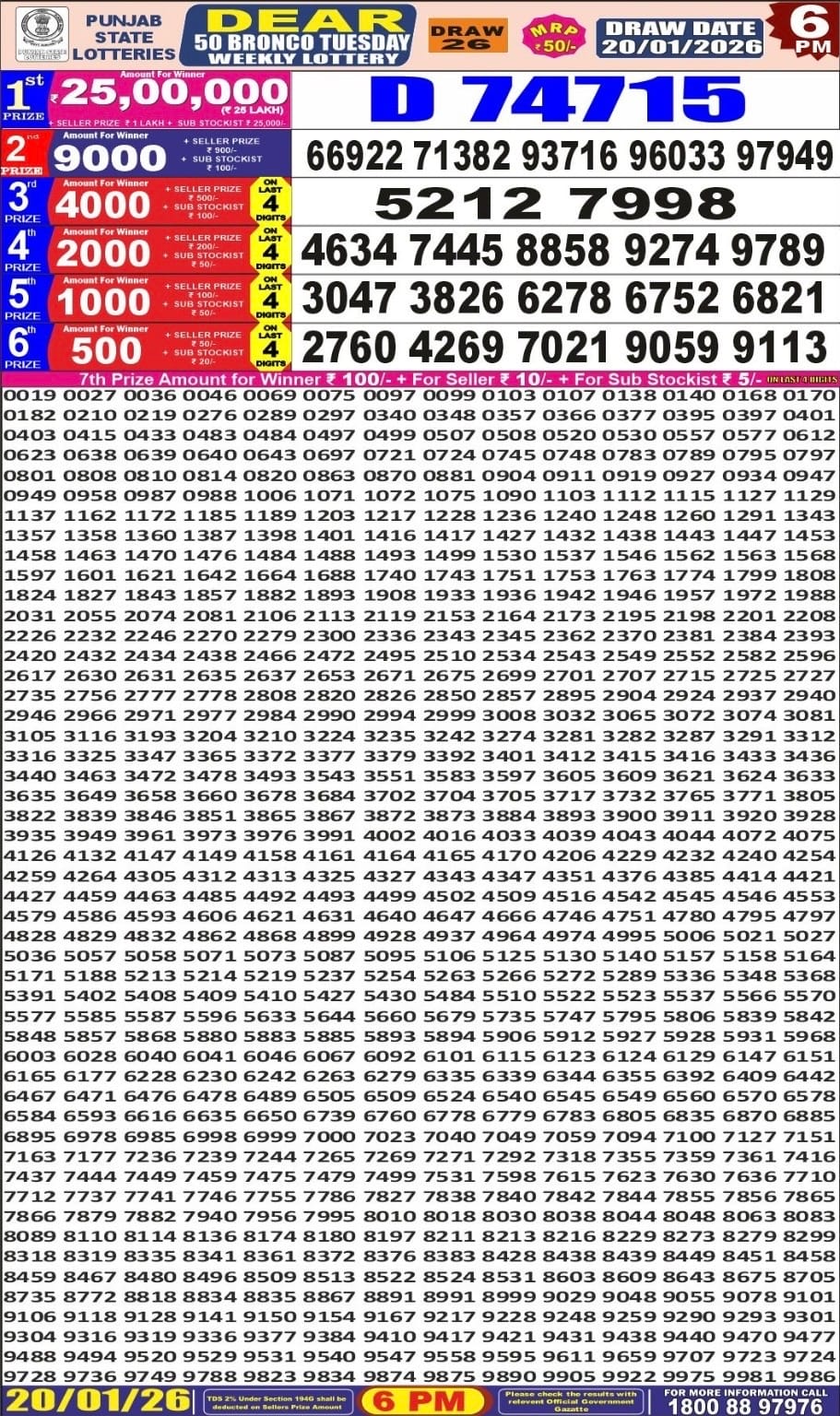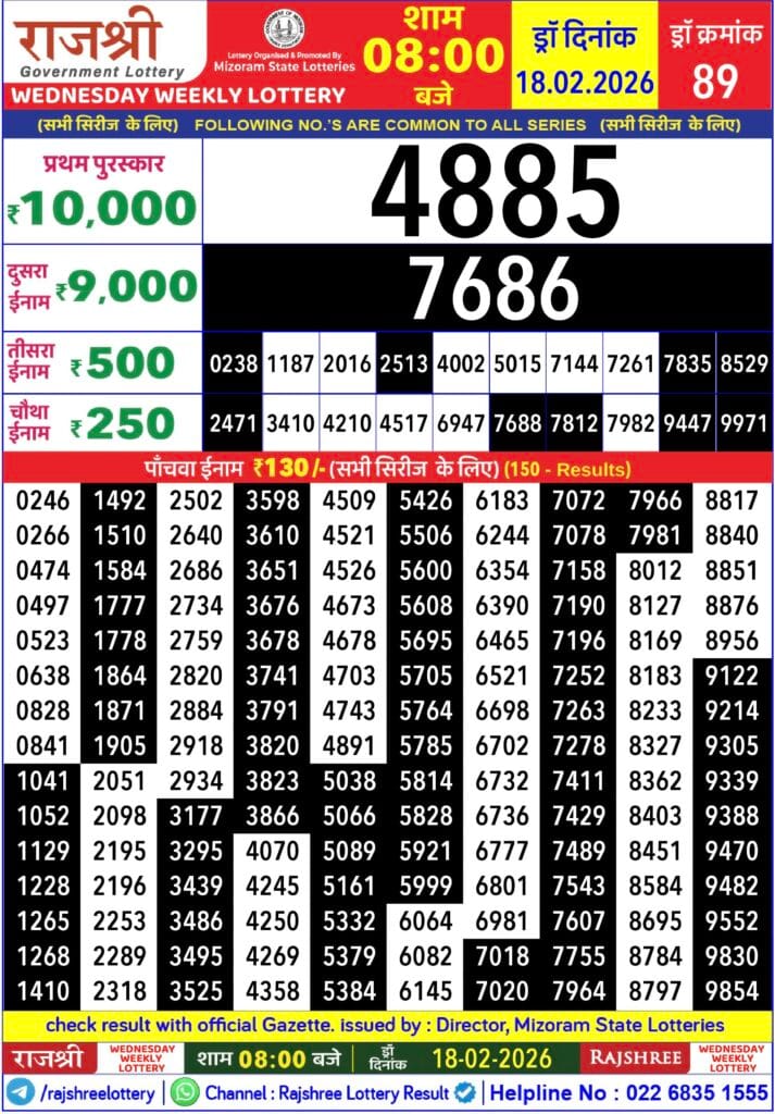 Rajshree Wednesday Weekly Lottery 18.2.2026 Result 8 PM 0 Likes 33 Views Related Articles 1 106Golden 250 Gold Monthly Lottery 23.07.2025 Result 6.30pm 0 34Maharashtra Ganeshlaxmi Dhan Weekly Draw 30.01.2026 Result 5pm 0 78Punjab State Dear 50 Buster Wednesday 6pm Lottery Result 17.09.2025 0 50Punjab State Dear 50 Bronco Tuesday 6pm Lottery Result 20.01.2026
