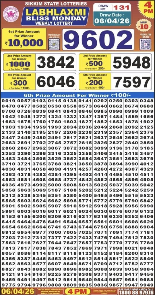 Sikkim State Labhlaxmi Bliss Monday Weekly Lottery 06.04.2026 Result 4 PM 0 Likes 29 Views Related Articles 0 102Maharashtra Gajraj (Monthly) Weekly Draw Result 28.01.2026 0 88Maharashtra Ganeshlaxmi Vijayee Weekly Draw 18.03.2026 Result 5 PM 0 117Maharashtra Sahyadri Mahalaxmi Weekly Draw 22.07.2025 Result 4.30pm 0 118Maharashtra Sahyadri Vijayalaxmi Weekly Draw 12.11.2025 Result 4.30pm