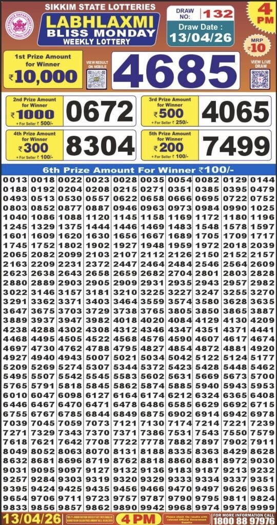 Sikkim State Labhlaxmi Bliss Monday Weekly Lottery 13.04.2026 Result 4 PM 0 Likes 5 Views Related Articles 0 74Maharashtra Gajlaxmi Budh Weekly Draw 25.03.2026 Result 4.45 PM 0 83Mizoram state golden 100 gold monthly lottery 7.1.2026 At 6.30 PM 0 15Maharashtra Gajlaxmi Shukra Weekly Draw 10.04.2026 Result 4.45 PM 0 81Punjab State Dear 50 Chief Thursday 6pm Lottery Result 22.01.2026