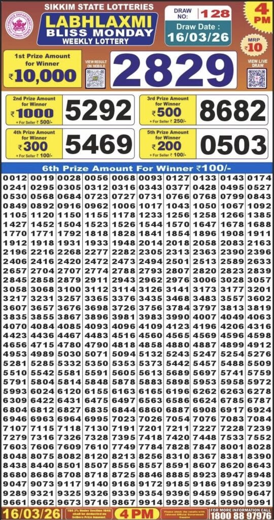 Sikkim State Labhlaxmi Bliss Monday Weekly Lottery 16.03.2026 Result 4 PM 0 Likes 40 Views Related Articles 0 94Punjab State Dear 50 6pm Lottery Result 27.01.2026 0 92Punjab State Dear 50 Beast Monday 6pm Lottery Result 10.11.2025 0 51Maharashtra Ganeshlaxmi Dhan Weekly Draw 06.03.2026 Result 5 PM 0 49Nagaland state dear 2000 monthly lottery 14.2.2026 at 7pm