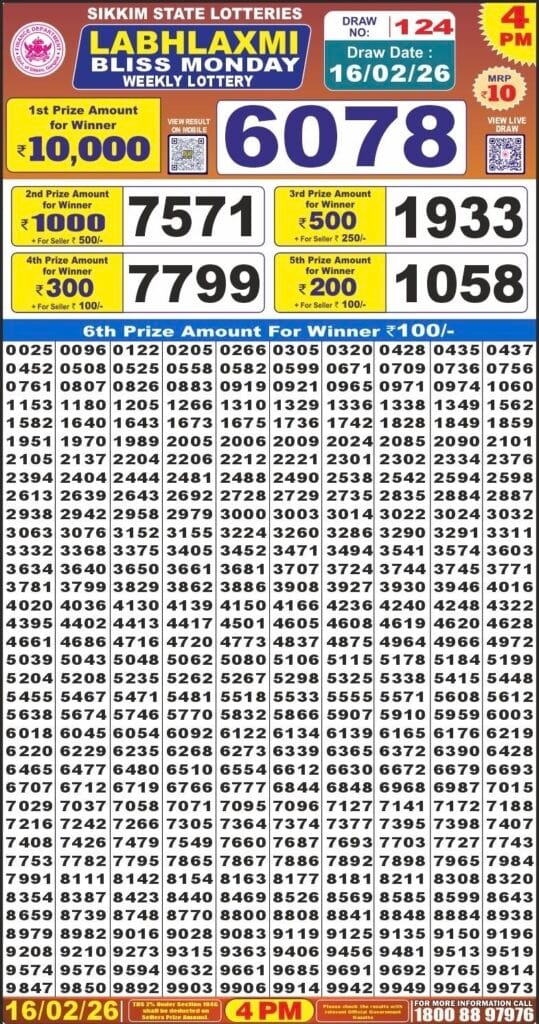 Sikkim State Labhlaxmi Bliss Monday Weekly Lottery 16.2.2026 Result 4 PM 0 Likes 21 Views Related Articles 1 98Rajshree 30 Lottery 8:30PM Daily Result 19 July 2025 0 105Maharashtra Padmini Weekly Draw Result 27.1.2026 0 82Maharashtra Ganeshlaxmi Bhagyashali Weekly Draw 21.07.2025 Result 5pm 0 302Golden 100 Gold Monthly Lottery 7.1.2026 At 6.30 PM