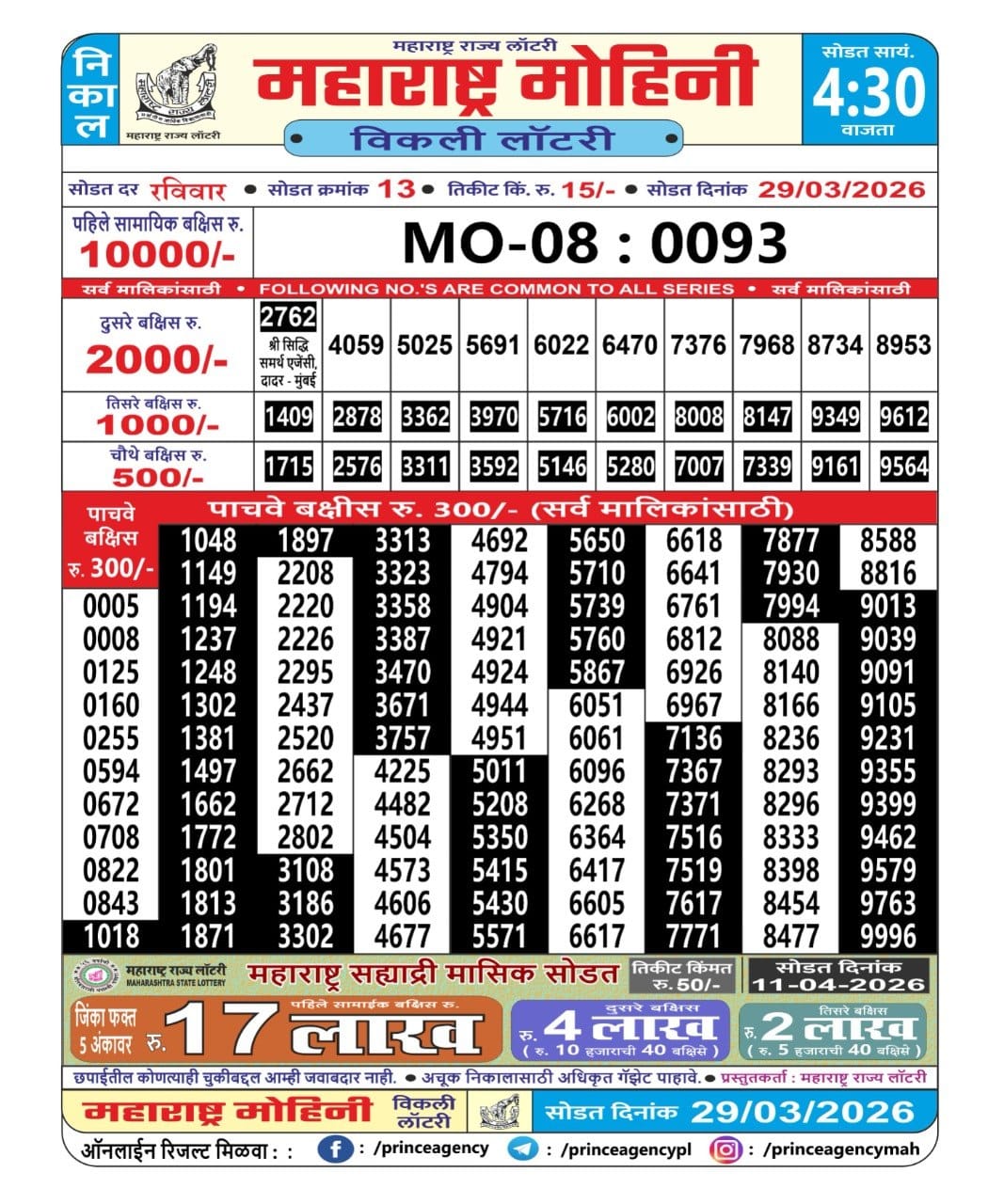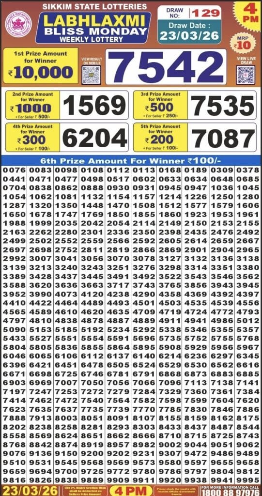 Sikkim State Labhlaxmi Bliss Monday Weekly Lottery 23.03.2026 Result 4 PM 0 Likes 30 Views Related Articles 0 113Maharashtra Akarshak Pushkaraj Weekly Draw Result 08.01.2026 0 79Golden Star Ravi Weekly Lottery 25.01.2026 Result 9pm 0 31Maharashtra Mohini Weekly Draw Result 29.03.2026 Result 4.30 PM 0 106Golden 100 Gold Monthly Lottery 4.2.2026 At 6.30 PM