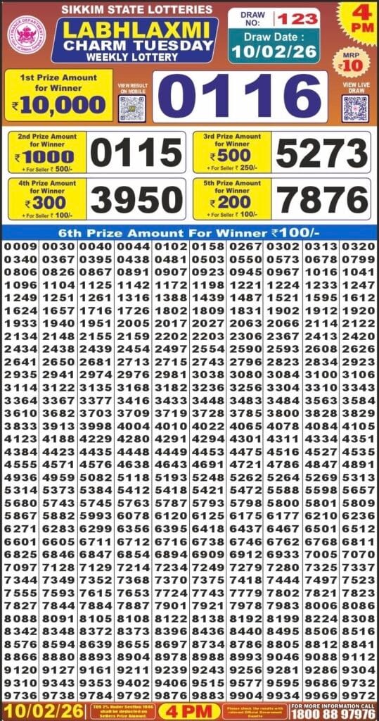 Sikkim State Labhlaxmi Charm Tuesday Weekly Lottery 10.2.2026 Result 4 PM 0 Likes 26 Views Related Articles 0 189Mizoram state golden 100 gold monthly lottery 5.11.2025 At 6.30 PM 0 129Maharashtra Gajlaxmi Ravi Weekly Draw 23.11.2025 Result 4.45pm 1 94Maharashtra Ganeshlaxmi Bhagyashali Weekly Draw 10.11.2025 Result 5pm 0 94Maharashtra Ganeshlaxmi Dhan Weekly Draw 14.11.2025 Result 5pm