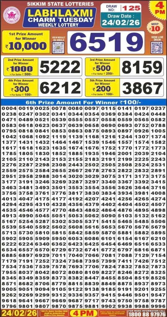 Sikkim State Labhlaxmi Charm Tuesday Weekly Lottery 24.2.2026 Result 4 PM
