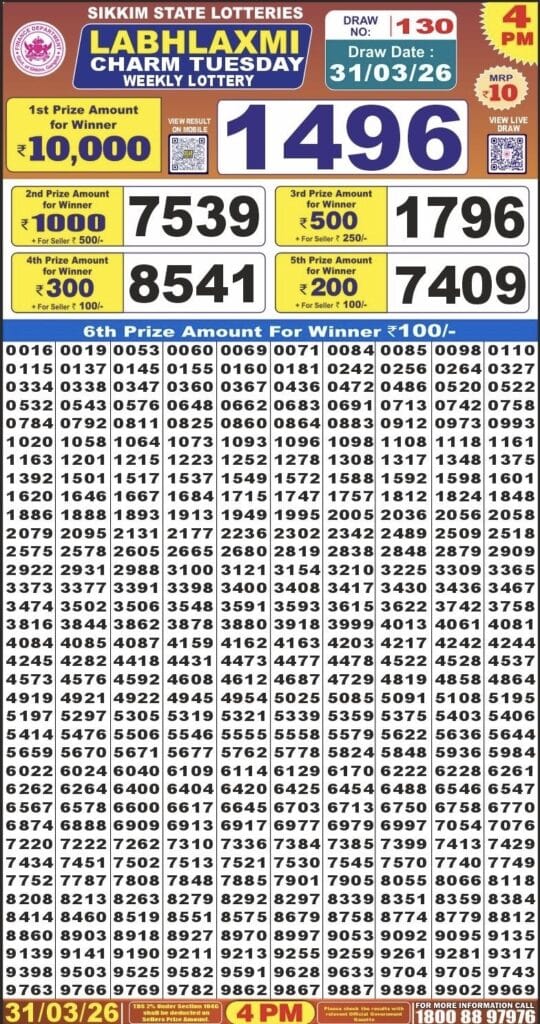 Sikkim State Labhlaxmi Charm Tuesday Weekly Lottery 31.03.2026 Result 4 PM 0 Likes 37 Views Related Articles 0 104Punjab state dear 100 monthly lottery 13.1.2026 at 7pm 0 138Rajshree 50 Monthly Lottery 22.1.2026 Result 6.30pm 0 42Rajshree Friday Weekly Lottery 03.04.2026 Result 8 PM 0 101Punjab State Dear 50 Ranger Sunday Weekly Lottery 15.2.2026 Result 5 PM