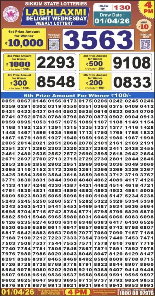 Sikkim State Labhlaxmi Delight Wednesday Weekly Lottery 01.04.2026 Result 4 PM 0 Likes 35 Views Related Articles 0 153Punjab state dear 50 monthly lottery 15-07-2025 at 6pm 0 117Maharashtra Gajlaxmi Shani Weekly Draw 14.02.2026 Result 4.45 PM 0 121Maharashtra Ganeshlaxmi Dhan Weekly Draw 28.11.2025 Result 5pm 0 57Rajshree 50 Guru Weekly Lottery 05.03.2026 Result 7.30 PM
