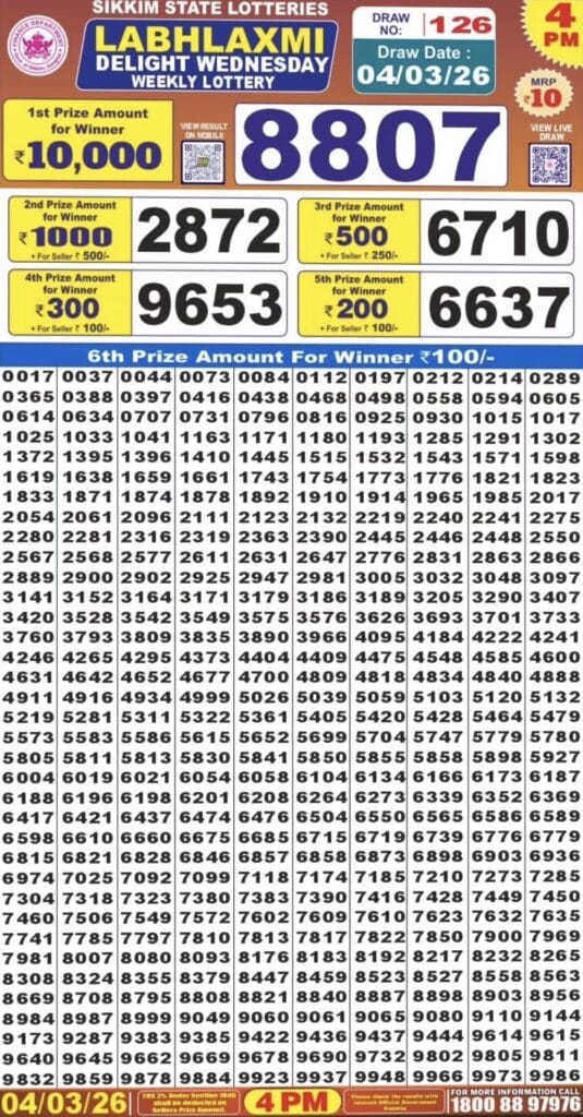 Sikkim State Labhlaxmi Delight Wednesday Weekly Lottery 04.03.2026 Result 4 PM 0 Likes 62 Views Related Articles 0 34Rajshree 50 Mangal Weekly Lottery 24.03.2026 Result 7.30 PM 0 79Maharashtra Ganeshlaxmi Dhan Weekly Draw 09.01.2026 Result 5 PM 0 25Maharashtra Mohini Weekly Draw 05.04.2026 Result 4.30 PM 0 56Rajshree Som Weekly Lottery 16.2.2026 Result 2.25 PM