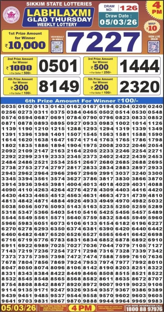 Sikkim State Labhlaxmi Glad Thursday Weekly Lottery 05.03.2026 Result 4 PM 0 Likes 61 Views Related Articles 0 96Punjab State Dear 50 Bronco Tuesday Weekly Lottery 10.2.2026 Result 5 PM 0 100Maharashtra Ganeshlaxmi Shubh Weekly Draw 27.01.2026 Result 5pm 0 57Rajshree 10 Evening Mangal Weekly Lottery 17.03.2026 Result 5.40 PM 0 32Maharashtra Tejaswini Monthly (Draw) Result 24.03.2026