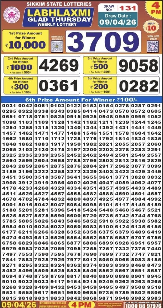 Sikkim State Labhlaxmi Glad Thursday Weekly Lottery 09.04.2026 Result 4 PM 0 Likes 13 Views Related Articles 1 106Punjab State Dear Lohri Makar Sankranti Bumper 17 January 2026 At 6 PM 1 34Goa state rajshree 150 monthly lottery 9.4.2026 at 6.30pm 1 301Maharashtra laxmi Weekly Draw Result 03.01.2026 0 57Punjab State Dear 50 Jackal Saturday Weekly Lottery 07.03.2026 Result 5 PM