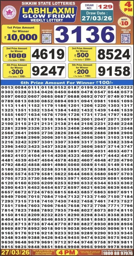 Sikkim State Labhlaxmi Glow Friday Weekly Lottery 27.03.2026 Result 4 PM