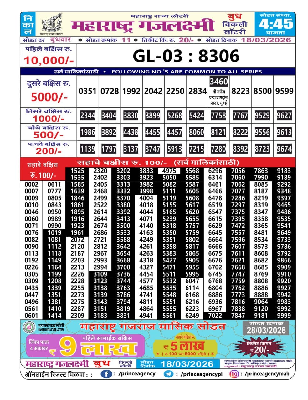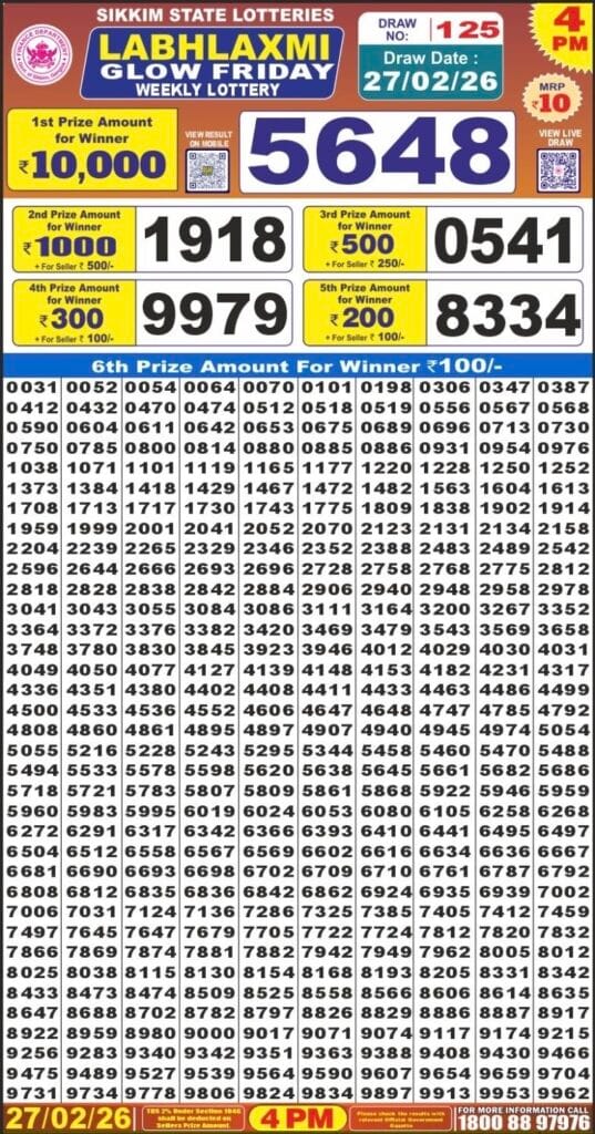 Sikkim State Labhlaxmi Glow Friday Weekly Lottery 27.2.2026 Result 4 PM