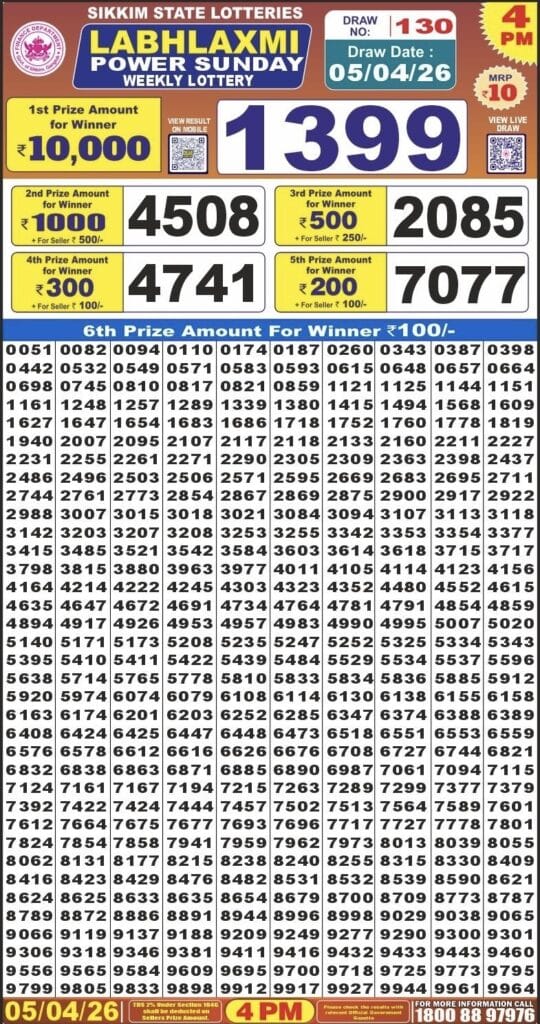 Sikkim State Labhlaxmi Power Sunday Weekly Lottery 05.04.2026 Result 4 PM 0 Likes 10 Views Related Articles 0 39Rajshree Night Guru Weekly Lottery 02.04.2026 Result 9 PM 0 91Sikkim State Dear May Day Bumper 2026 Lottery New Scheme 0 60Sikkim State Labhlaxmi Glow Friday Weekly Lottery 6.2.2026 Result 4 PM 0 141Maharashtra Gajlaxmi Shani Weekly Draw 29.11.2025 Result 4.45pm