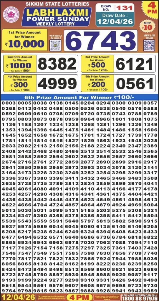 Sikkim State Labhlaxmi Power Sunday Weekly Lottery 12.04.2026 Result 4 PM 0 Likes 5 Views Related Articles 0 59Rajshree Monday Weekly Lottery 02.03.2026 Result 8 PM 0 46Rajshree Lotus Weekly Lottery 19.2.2026 Result 4 PM 0 85Maharashtra Ganeshlaxmi Vaijayee Weekly Draw 21.01.2026 Result 5pm 0 37Rajshree Orchid Weekly Lottery 21.2.2026 Result 4 PM