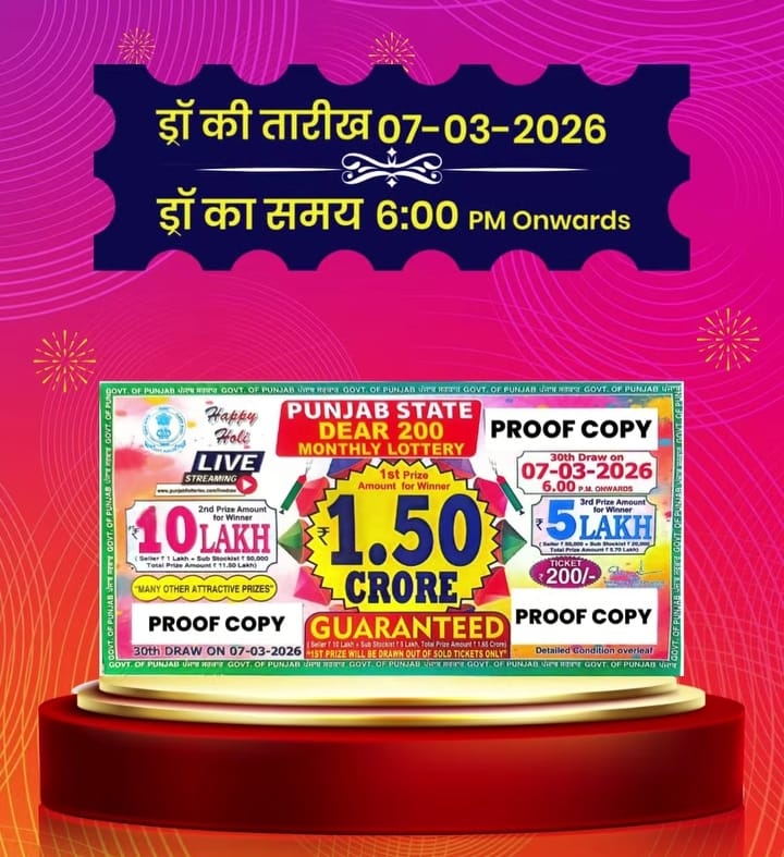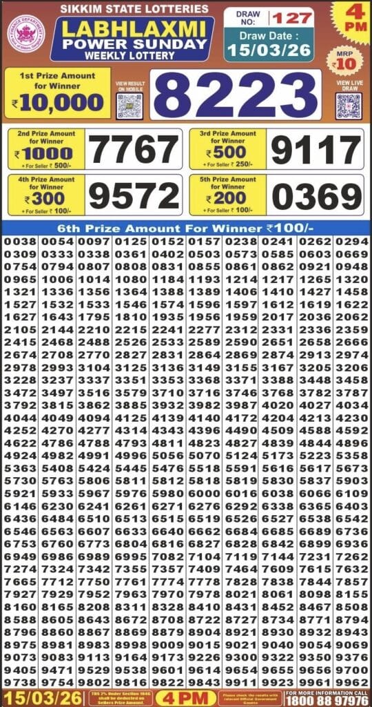 Sikkim State Labhlaxmi Power Sunday Weekly Lottery 15.03.2026 Result 4 PM 0 Likes 53 Views Related Articles 0 72Punjab state dear 200 monthly lottery 7 march 2026 at 6pm (Holi Special) 0 144Rajshree Diwali Special Lottery 30.10.2025 Result 6.30 PM 0 153Maharashtra Gajlaxmi Guru Weekly Draw 13.11.2025 Result 4.45pm 0 110Maharashtra Sahyadri Prabhalaxmi Weekly Draw 17.01.2026 Result 4.30pm