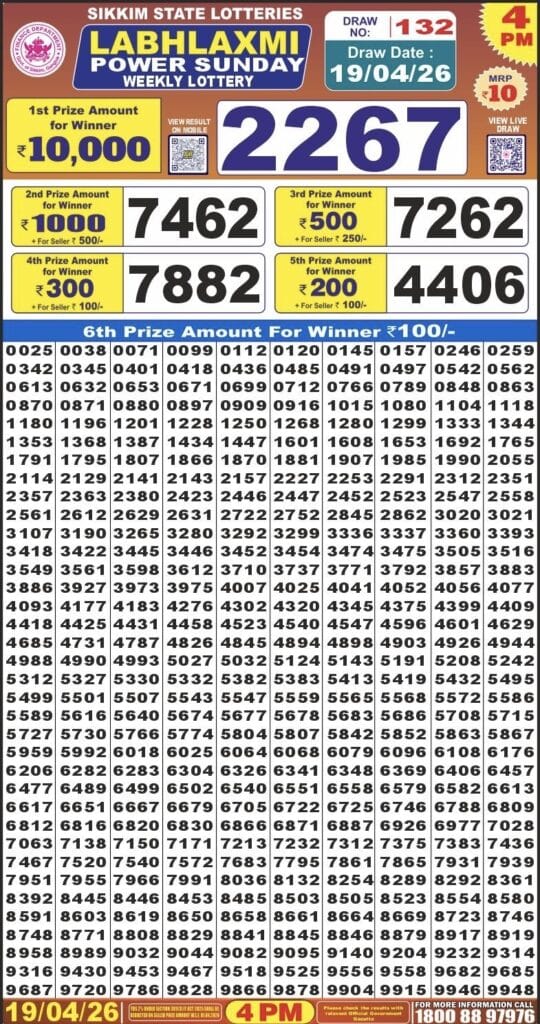Sikkim State Labhlaxmi Power Sunday Weekly Lottery 19.04.2026 Result 4 PM 0 Likes 7 Views Related Articles 0 56Punjab State Dear 50 Colt Friday Weekly Lottery 06.03.2026 Result 5 PM 0 160Maharashtra Sahyadri Deeplaxmi Weekly Draw 20.11.2025 Result 4.30pm 0 89Nagaland State Dear Special Bumper 2025 Lottery 22 November 2025 At 6 PM 1 152Maharashtra Padmini Weekly Draw Result 28.10.2025